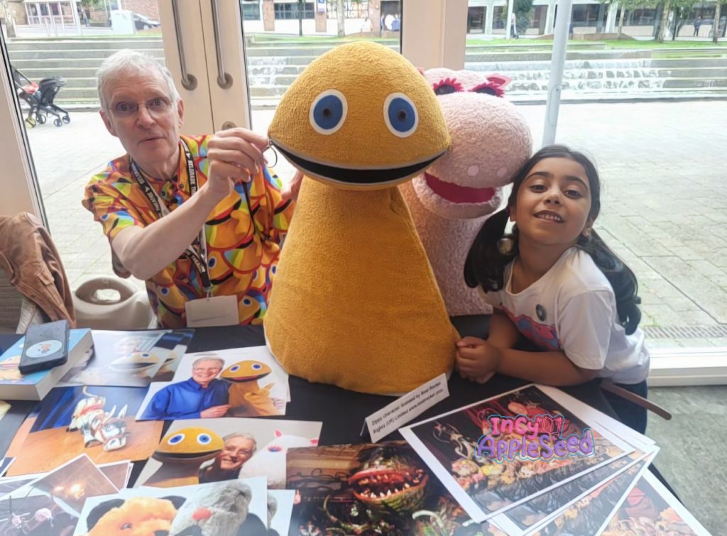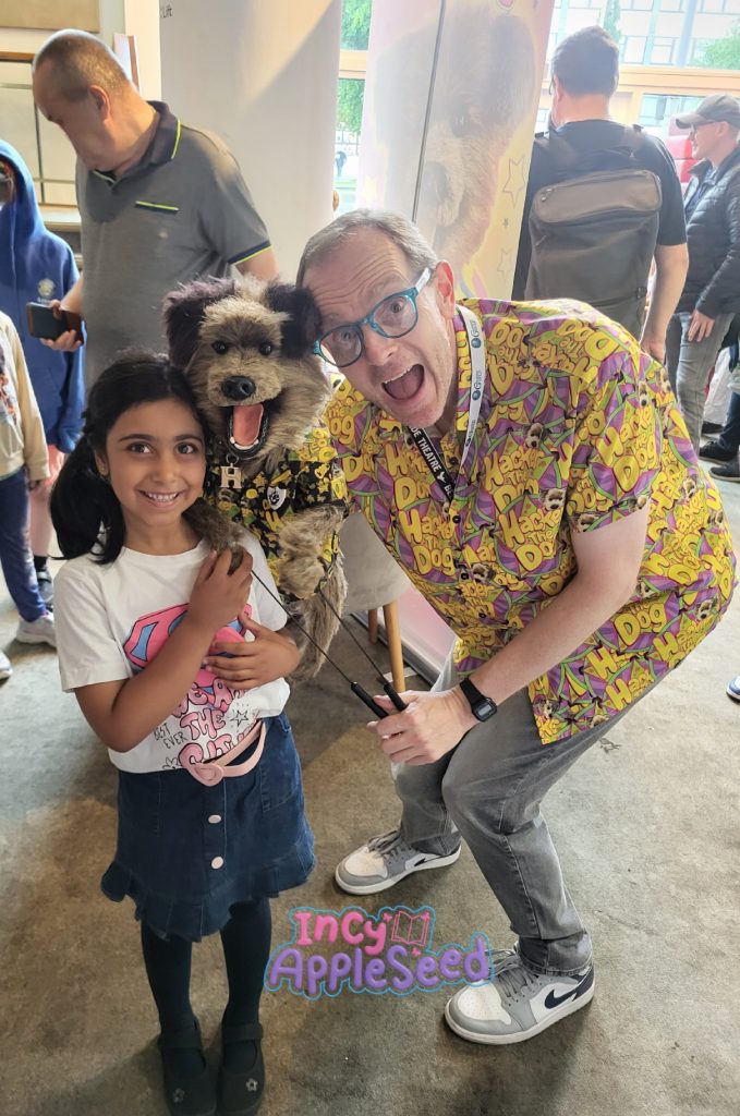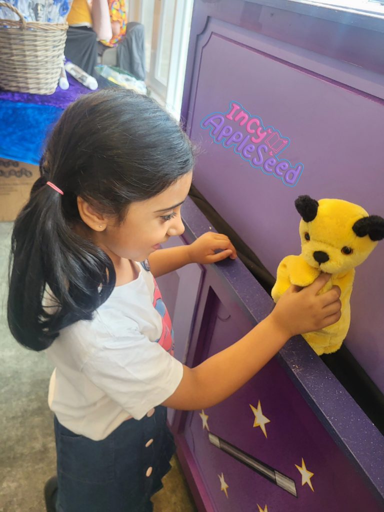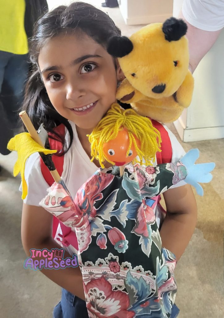 We were almost at the end of the event so we popped over to visit the Rainbow characters. Rainbow is a TV show from a long time ago and all the mummies and daddies knew what it was but only some of the children did. Incy had seen only a little of the show but she recognised Zippy immediately. Ronnie, the puppeteer who controls Zippy, had a lovely chat with Incy. Ronnie’s enthusiasm for puppetry was evident as he wanted to try Incy’s puppet, Flower, and then he animated Zippy to speak with Flower. Incy asked Zippy if he was ever naughty and he said sometimes!